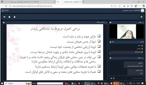به همت مدرسه علمیه تخصصی حضرت عبدالعظیم( علیه السلام)، نشست تخصصی تبیین کتاب" شادکامی میتنی بر قرآن و روایات" با حضور دکتر فاطمه فیاض، فوق دکترای روانشناسی از دانشگاه تهران و استادیار پژوهشکده زنان دانشگاه الزهراء، روز چهارشنبه ۲۶ آذر ماه ساعت ۱۴:۰۰، به صورت برخط برگزار گردید.